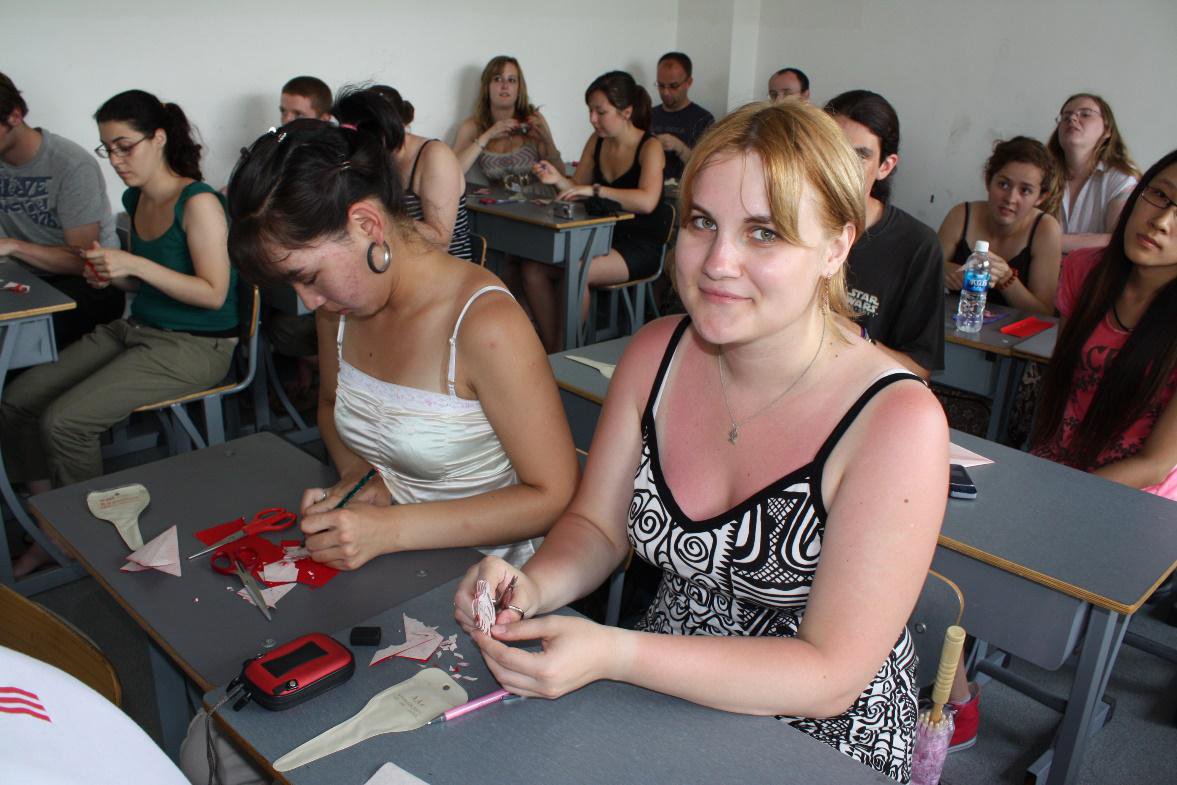 Handcraft lesson. Students are trying to make Jian Zhi- Chinese paper cutting. Paper-cutting is one of the oldest and the most popular folk arts in China. Usually, the artworks are made of red paper, as red is associated with festivities in Chinese culture, but other colours were also used. Normally paper-cutting artwork is used on festivals like Spring Festival, weddings and childbirth. Papercuts always symbolizes luck and happiness. Students use it to liven up walls, windows, doors, columns, mirrors, lamps and lanterns in dormitory. Paper cut-outs pasted on or near entrances are supposed to bring good luck.