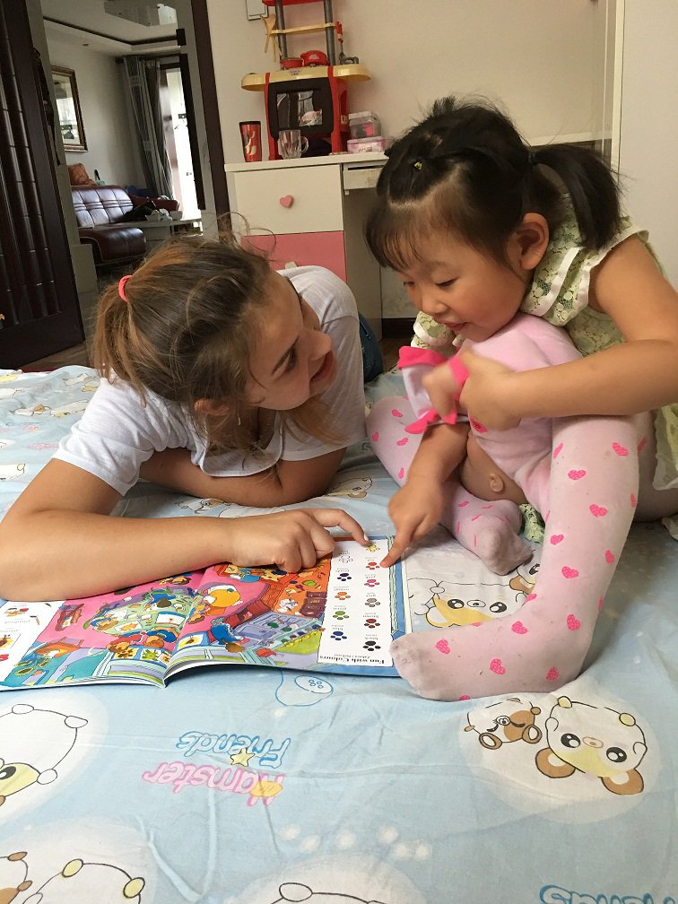 Reading books is a very important part of children's education. Dragon Education's au pair from Slovakia, Nika, knows it very well and encourages her little Chinese sister to read books everyday. Various interesting stories, colourful pictures - little PaoPao loves books! Nika reads books to PaoPao aloud, shows her pictures and teaches her new English words! PaoPao is happy because she listens to her favourite story and gets to know many new English words. This is such a comfortable way to learn a foreign language. You do not even feel that you actually learn anything. It is so good to have a foreign sister at home!